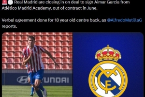 罗马诺写道:“皇马接近敲定马竞青训后卫艾马尔·加西亚,他与马竞的合同将在6月份到期,皇马已经与这位18岁中卫达成口头协议。”