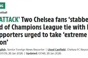体育资讯01月28日讯 切尔西客战那不勒斯的欧冠关键战赛前,切尔西发表声明,称2名切尔西球迷在那不勒斯受伤。据太阳报报道,两名切尔西球迷被那不勒斯极端球迷追赶后刺伤。