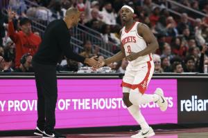 在日前火箭对阵尼克斯的比赛中,泰特遭唐斯一屁股坐到右膝盖,随后被队友搀扶离场。