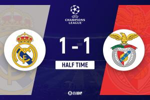 半场-皇马暂1-1本菲卡 拉法破门琼阿梅尼兜射扳平 居莱尔进球被吹