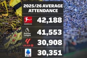 本赛季欧洲联赛场均上座人数排名: